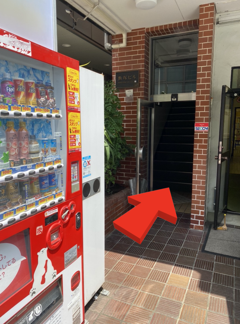 A. 看板付きの自動販売機がある建物(飯塚ビル)になります。