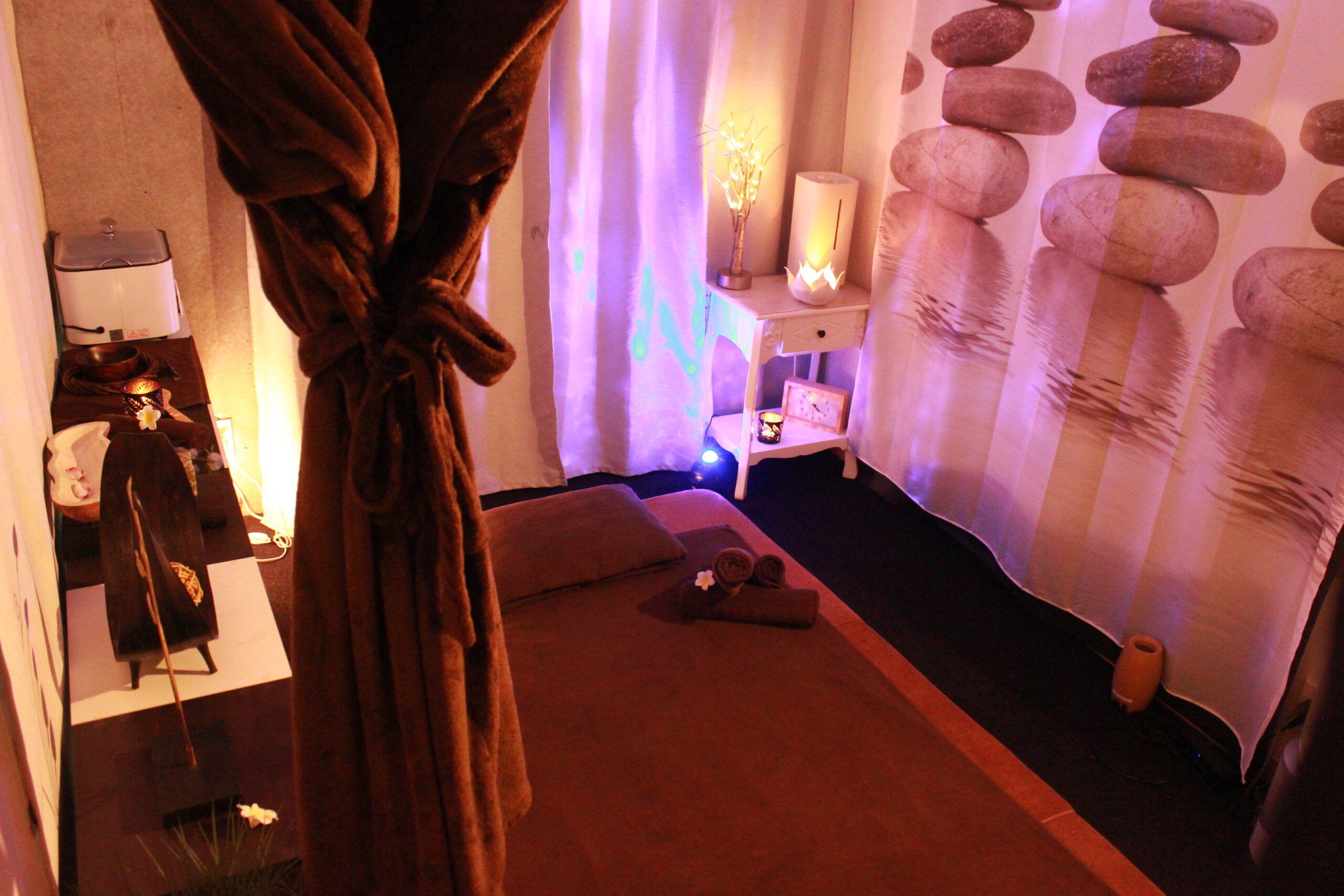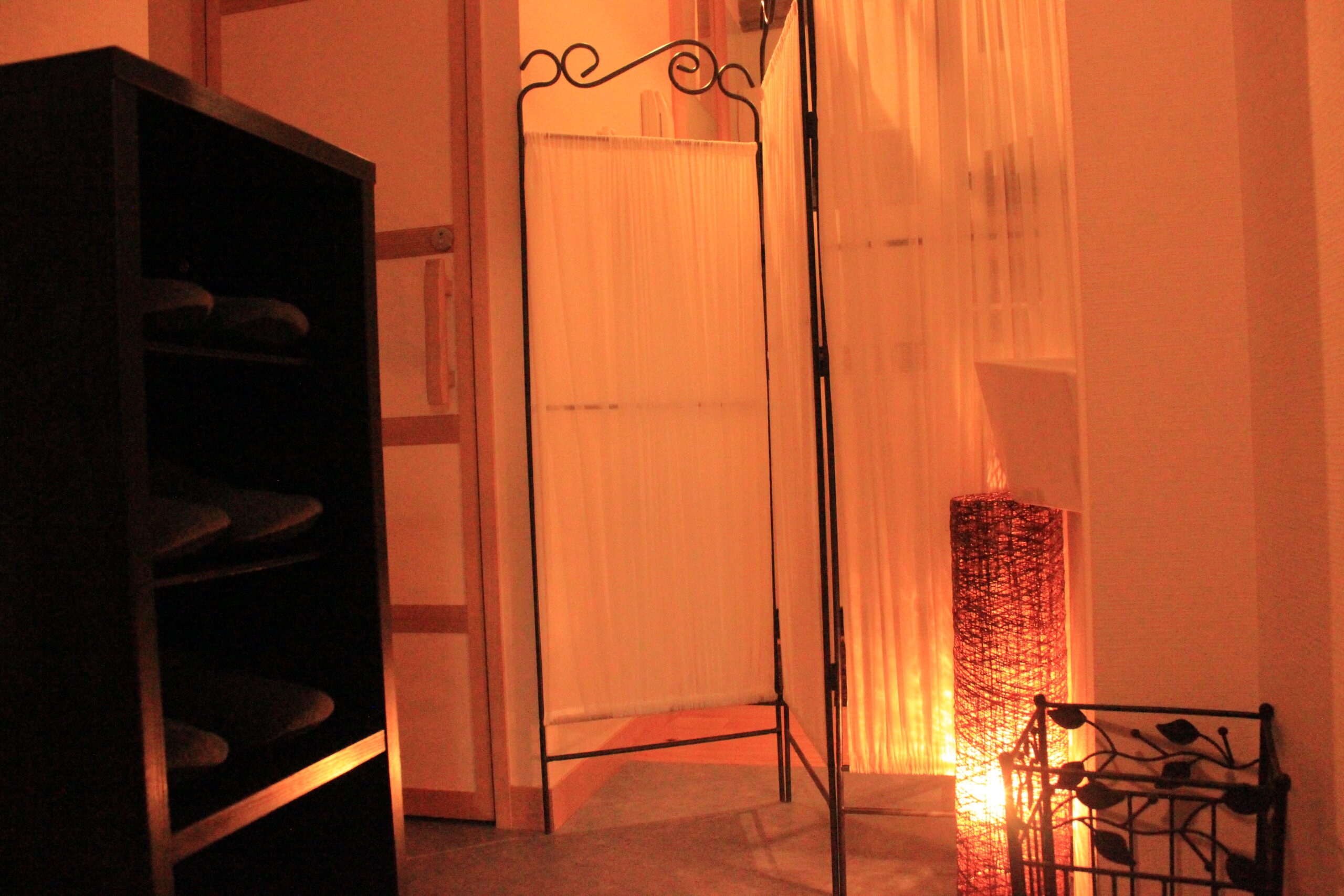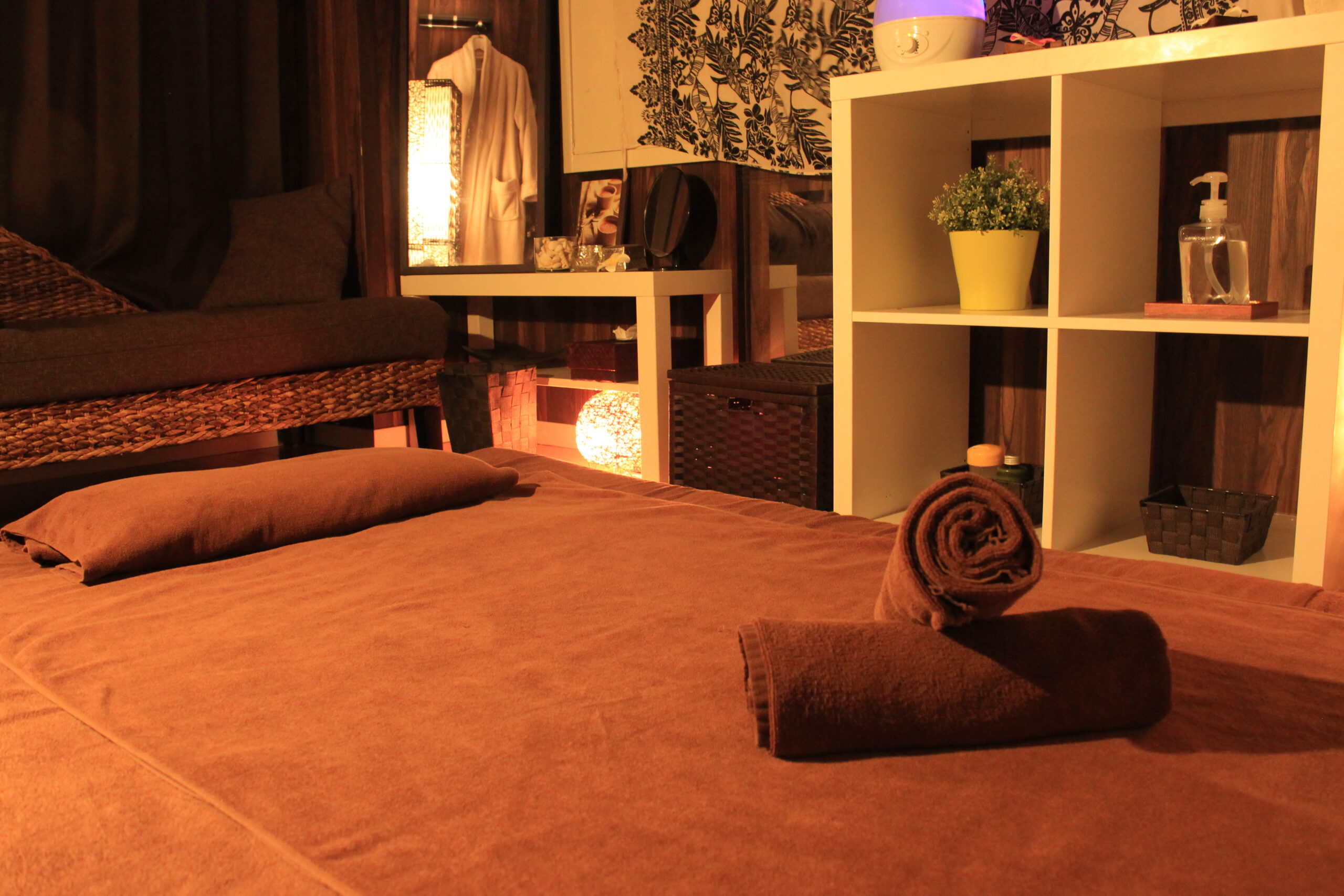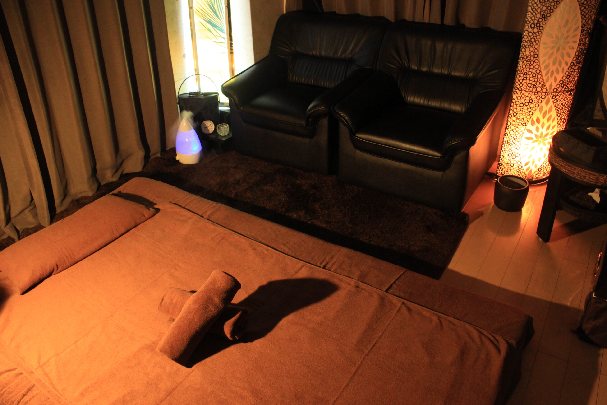 マッサージに使用するアロマオイルの香りと、やさしい照明に包まれた空間で、心からリラックスできる至福のひとときをお過ごしいただけます。